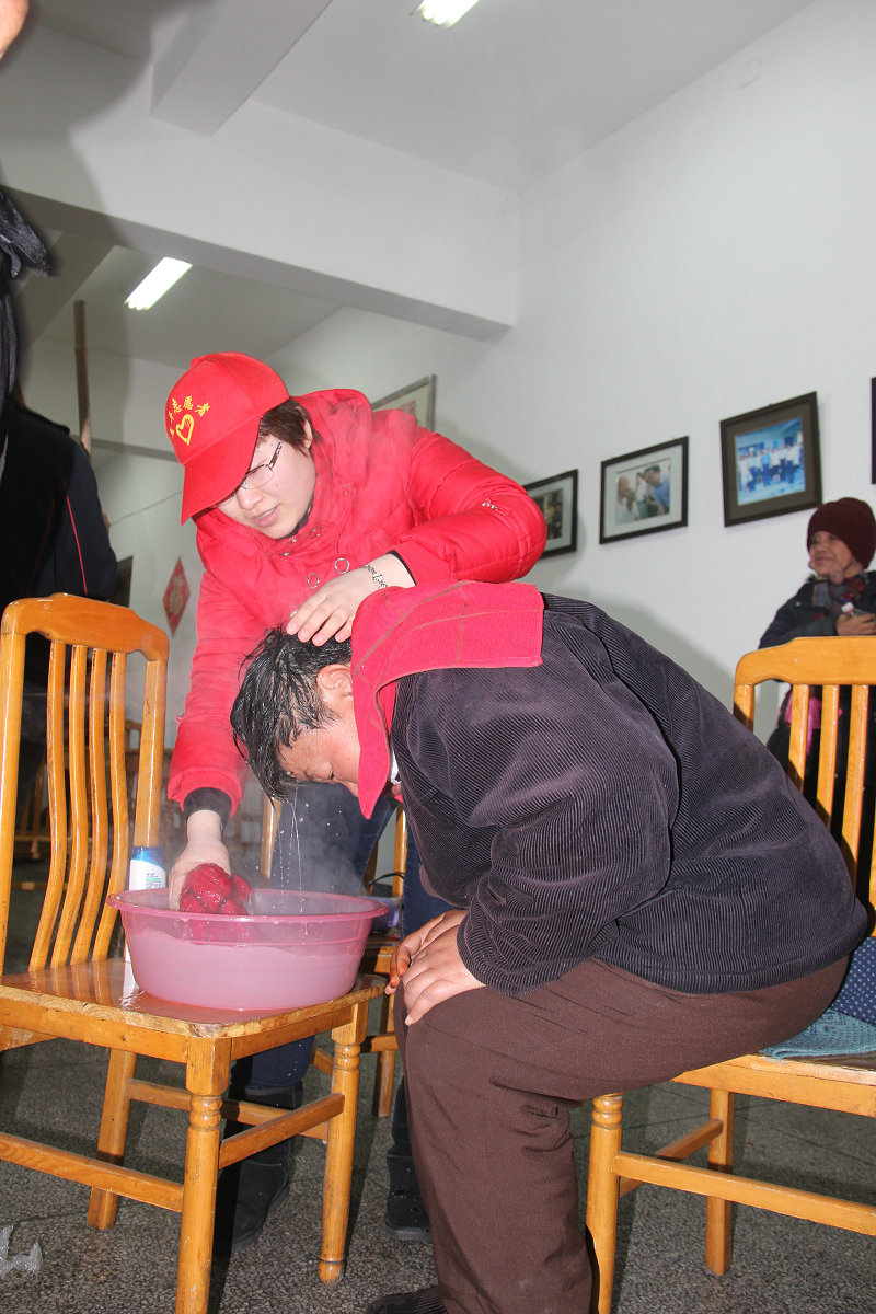 圖為集團志愿者正在為柯橋夕陽(yáng)紅中心老人洗頭