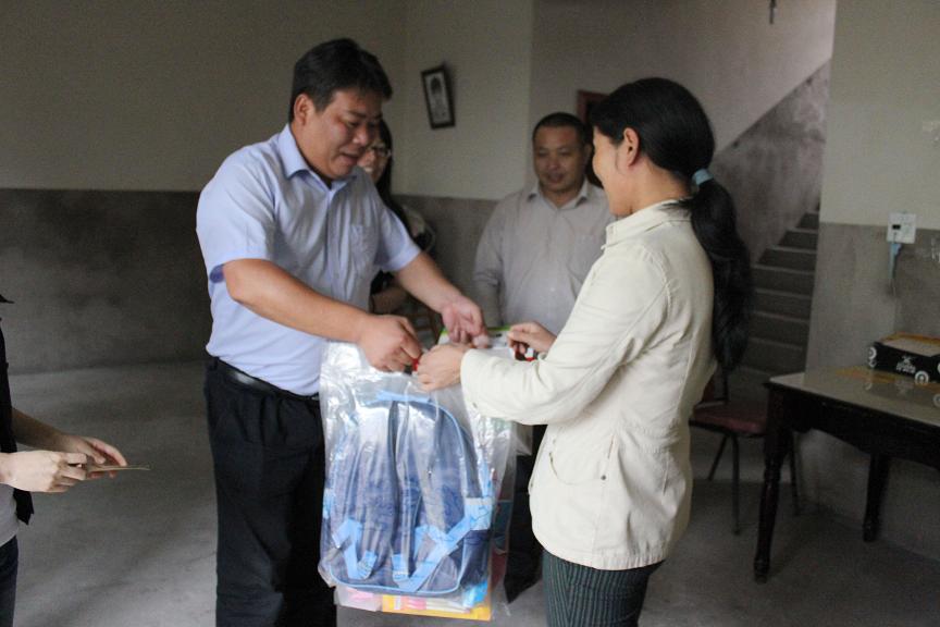 圖為濱海供水公司代表為馬鞍鎮結對貧困兒童送去書(shū)包的慰問(wèn)品及慰問(wèn)金