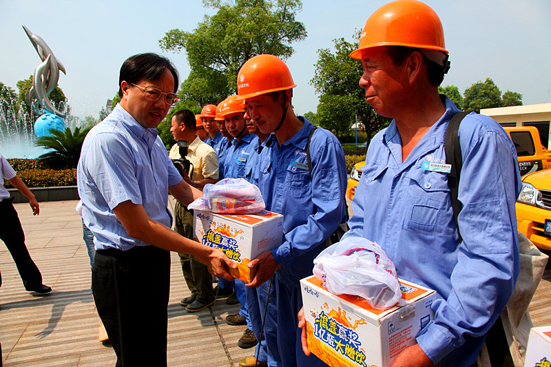 7月12日上午,縣委書(shū)記何加順、副縣長(cháng)周樹(shù)森等縣委、縣政府領(lǐng)導來(lái)到供水公司慰問(wèn)在高溫下作業(yè)的供水一線(xiàn)職工,親手把防暑降溫慰問(wèn)品送到他們手上,并再三叮囑有關(guān)人員落實(shí)好夏季高溫時(shí)段的防暑降溫措施,確保一線(xiàn)職工身體健康。集團董事長(cháng)倪阿泉、總經(jīng)理單寶子等領(lǐng)導陪同慰問(wèn)。