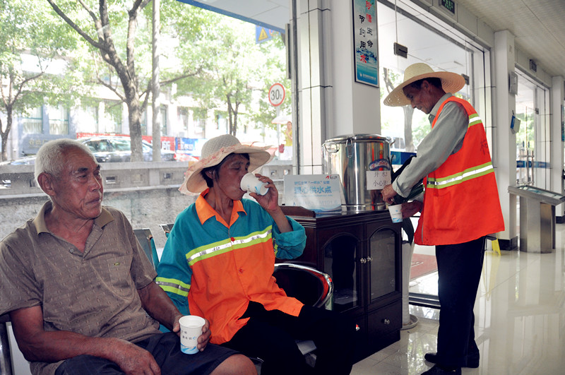 今年6月以來(lái),供水公司積極響應浙江之聲廣播電臺發(fā)起的“一杯水”大型公益活動(dòng),在全區13個(gè)供水營(yíng)業(yè)大廳設置了免費供水點(diǎn),并配備了醫藥箱,為高溫下的環(huán)衛工人、交警、路政、快遞員等一線(xiàn)勞動(dòng)者提供一處納涼地。公司已連續三年開(kāi)展該活動(dòng),目前已累計提供9000多次服務(wù)。圖為三位老人正在城區供水營(yíng)業(yè)廳飲用茶水。