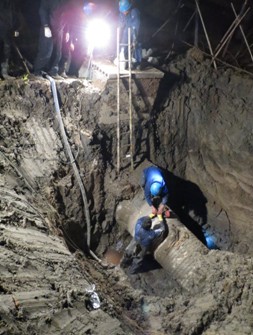 11月23日,濱海北側泵站DN500進(jìn)水管多處斷裂,導致濱海興濱路華納藥業(yè)門(mén)口的綠化帶上出現了一條長(cháng)50米,寬3米深1米的溝壑,情況十分危險。維修分公司立即組織人員趕赴現場(chǎng)勘察,面對路面濕滑結冰;高壓電線(xiàn)、水管光纜錯綜復雜;管道破損區域廣、埋藏深度深等困難,維修員們早出晚歸,每天工作12小時(shí),歷時(shí)17天,修復管道一百三十余米,終于在12月8日,順利完成濱海興濱路DN500管搶修工作。
