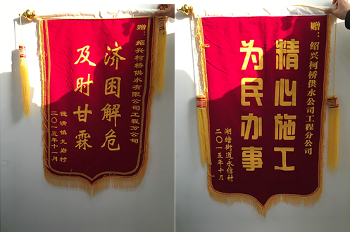 12月29日下午,公司相繼收到湖塘街道永信村和錢(qián)清九巖村村委送來(lái)的“濟困解危,及時(shí)甘霖”和“精心施工,為民辦事”兩面錦旗,對工程分公司工作人員辛勤勞動(dòng)、甘于奉獻的工作精神表示贊賞和感謝。