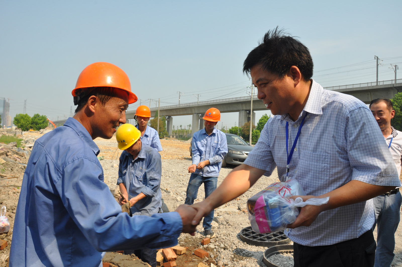 月27日上午,集團公司董事長(cháng)周儉在公司董事長(cháng)谷連森、總經(jīng)理李葉茂等領(lǐng)導的陪同下,前往柯橋城區金昌誠園小區和興華路與鏡水路交叉口配套工程施工現場(chǎng),慰問(wèn)堅守崗位的一線(xiàn)職工,為他們送上了消暑飲料及毛巾等防暑用品,并叮囑大家在高溫酷暑下盡量錯時(shí)作業(yè),注意做好防暑措施。