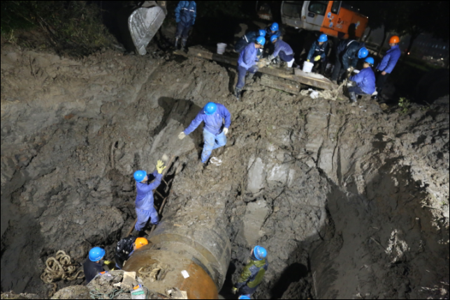 1月17日晚,紹興柯橋濱海供水公司搶修人員在寒夜中冒雨搶修DN1000一期原水管。據了解,該管線(xiàn)位于興濱路與越北路交叉口以南,是公司輸送原水的重要管線(xiàn),公司根據工業(yè)區供水情況,在不影響企業(yè)用水的前提下展開(kāi)搶修工作,經(jīng)過(guò)開(kāi)挖、電焊等工序,連續工作12小時(shí)后,直至晚上9點(diǎn)原水管搶修完成。