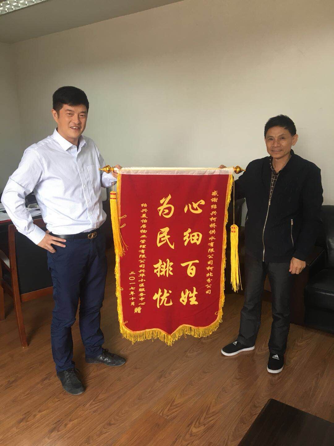 10月24日,華舍街道紹興美怡居物業(yè)管理有限公司興華小區服務(wù)中心負責人專(zhuān)程送來(lái)錦旗,感謝柯北分公司向他們提供優(yōu)質(zhì)高效的服務(wù)。